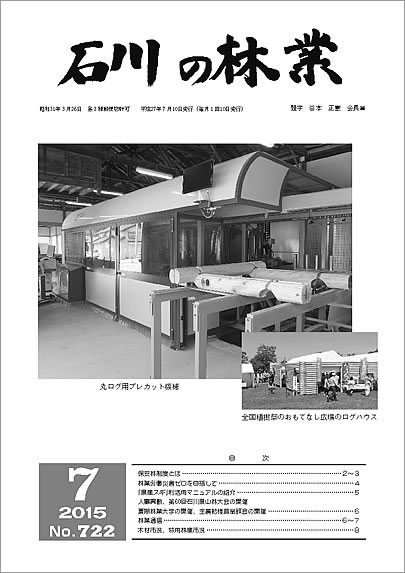 表紙写真:丸ログ用プレカット機械・全国植樹祭のおもてなし広場のログハウス