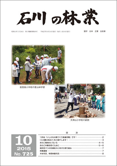 表紙写真:能登島小学校の里山林学習・天神山小学校の薪割
